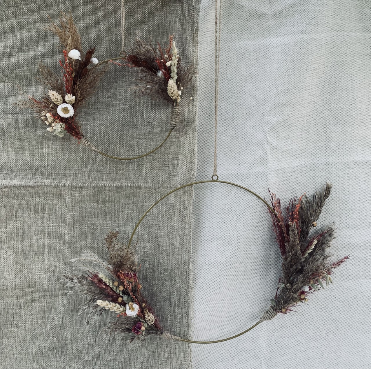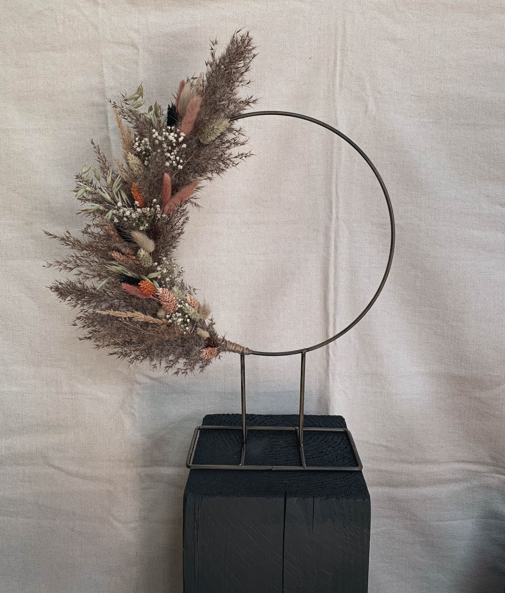 Metalen ring met droogbloemen in de kleuren: roze, groen, oranje & naturel.