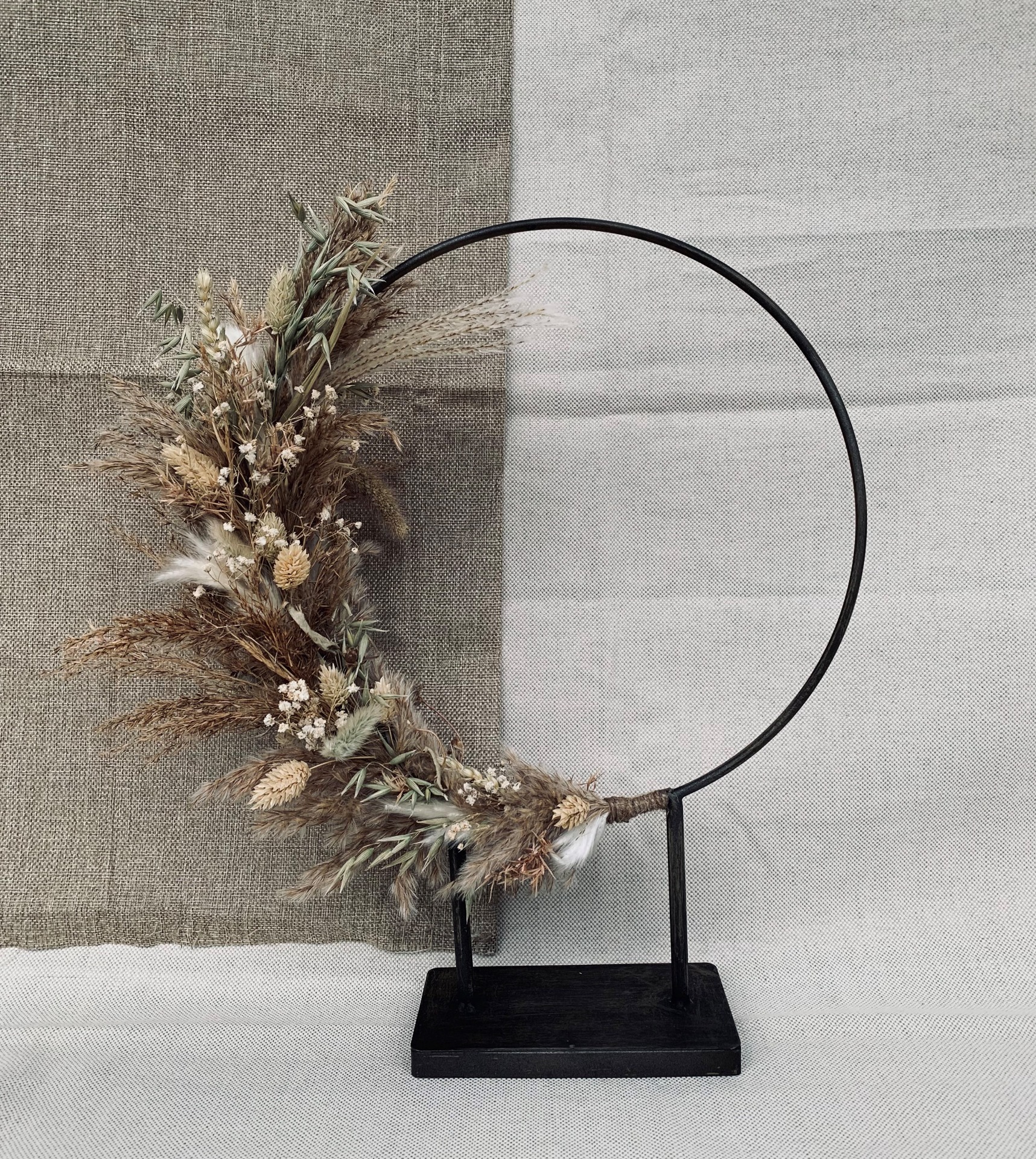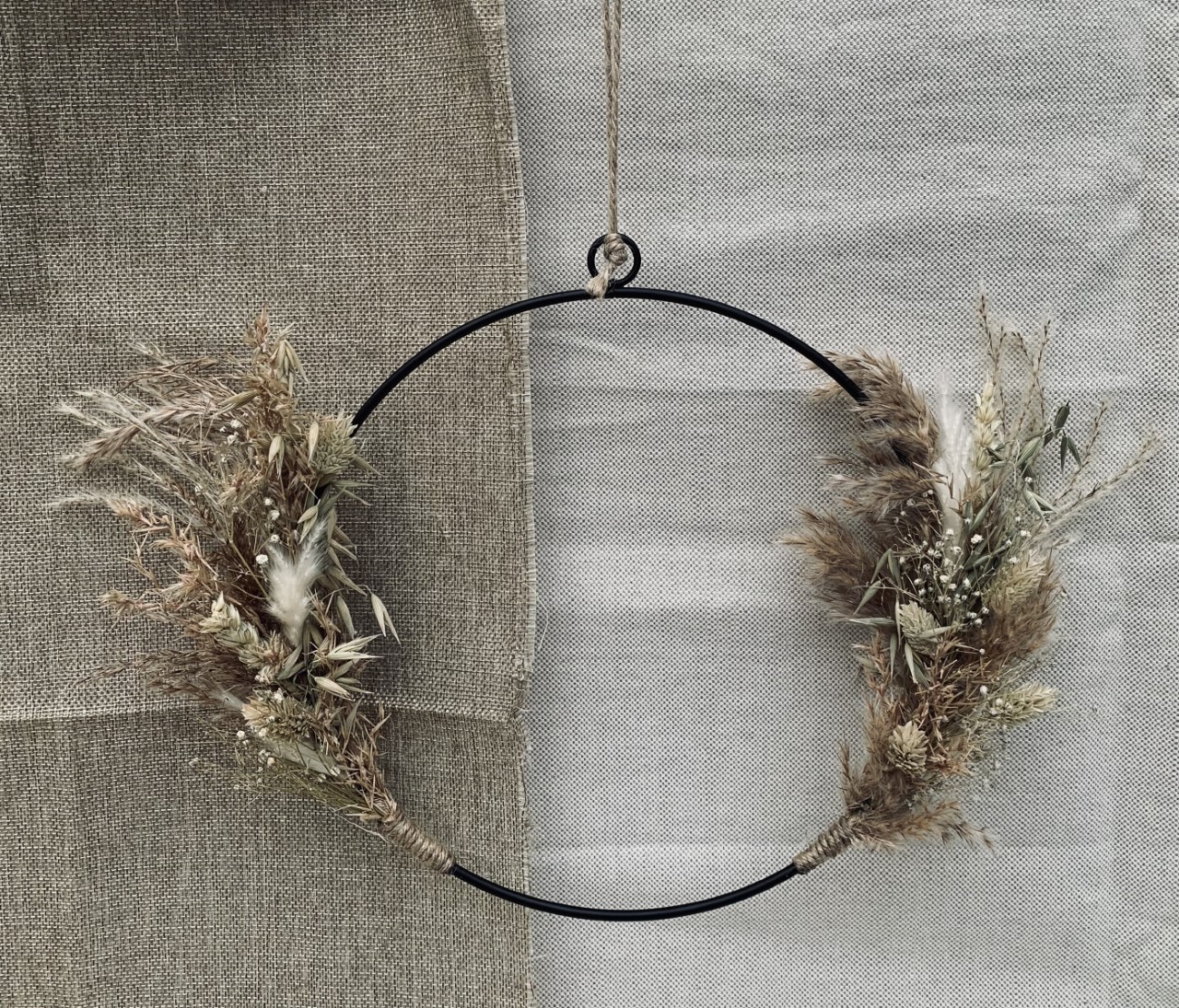 Natuurlijke zwarte ringen met droogbloemen design. Deze muurhanger past in ieder interieur.