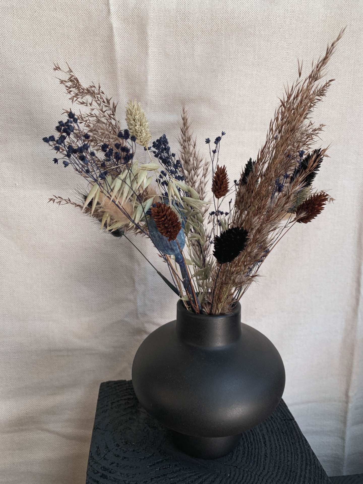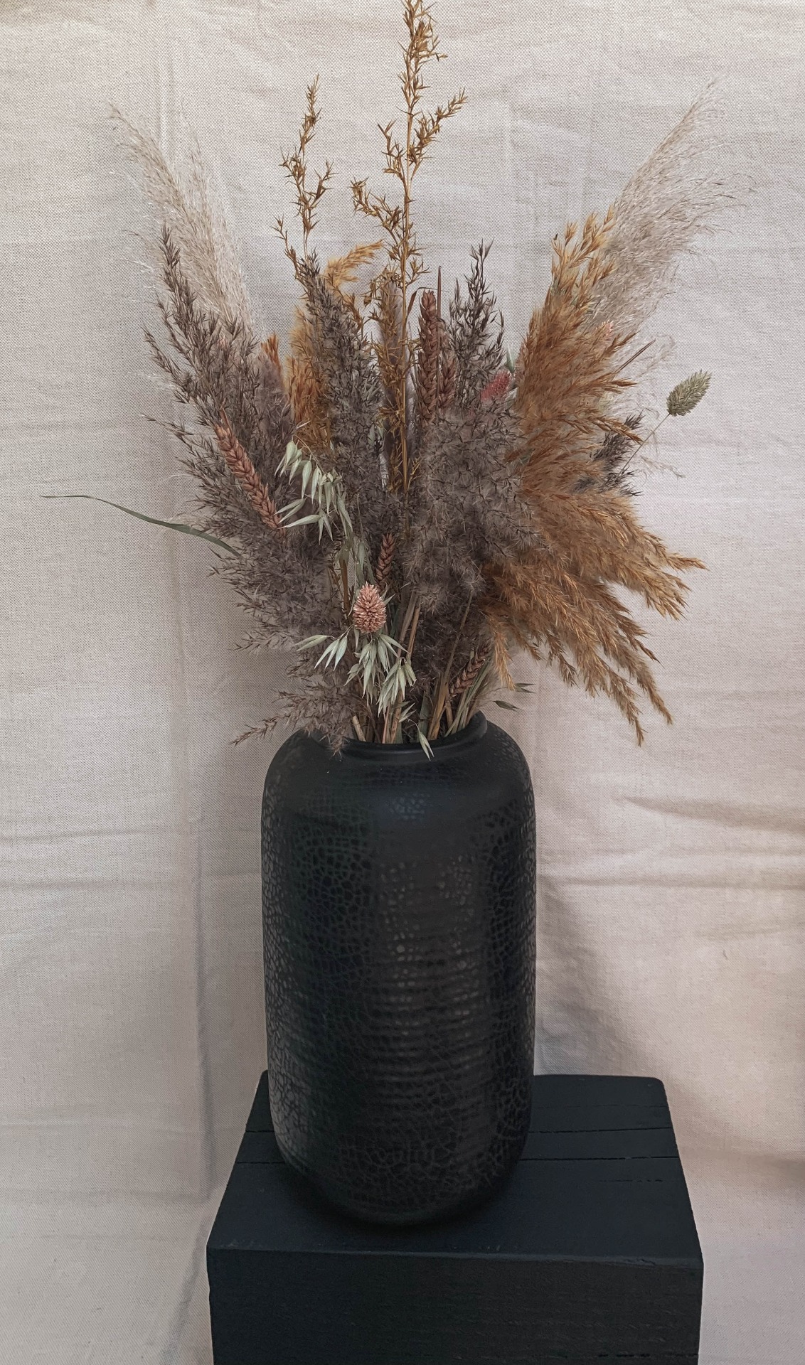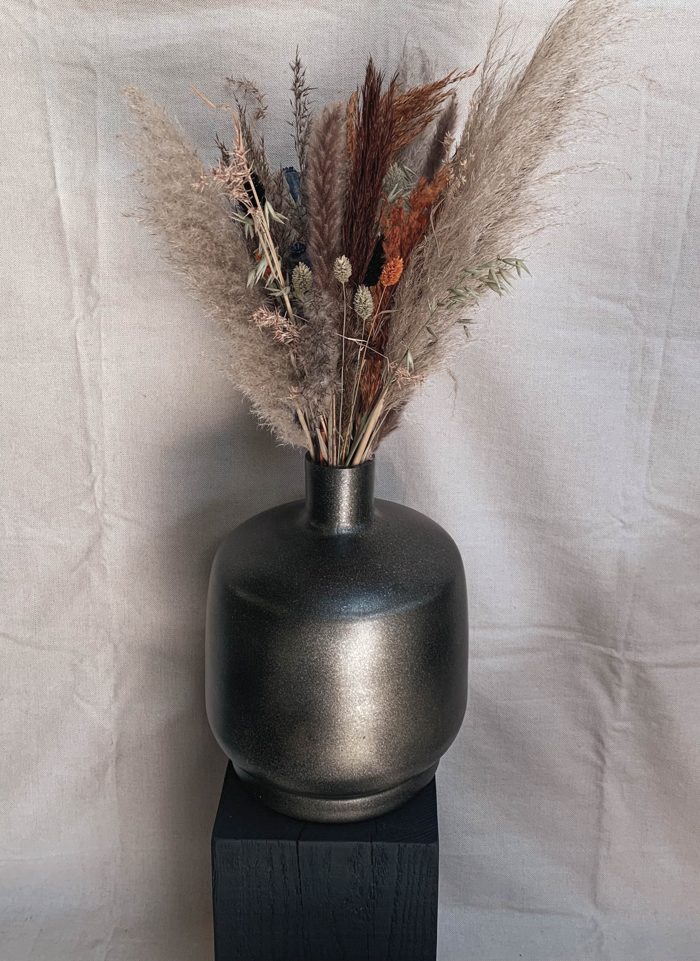 Vaas in brons look. Gevuld met verschillende kleuren droogbloemen.