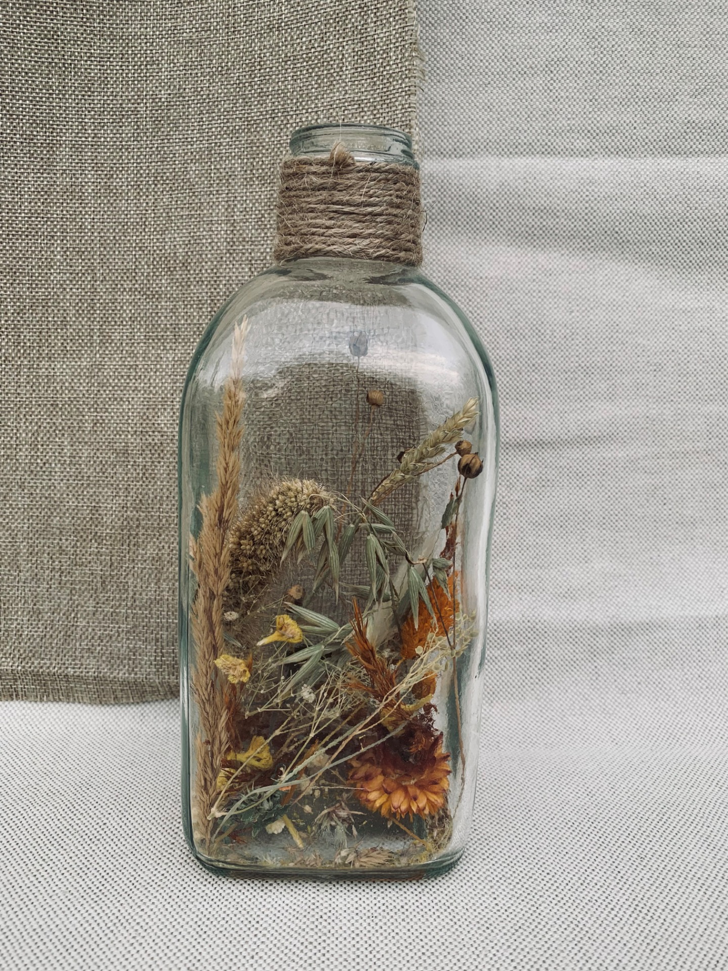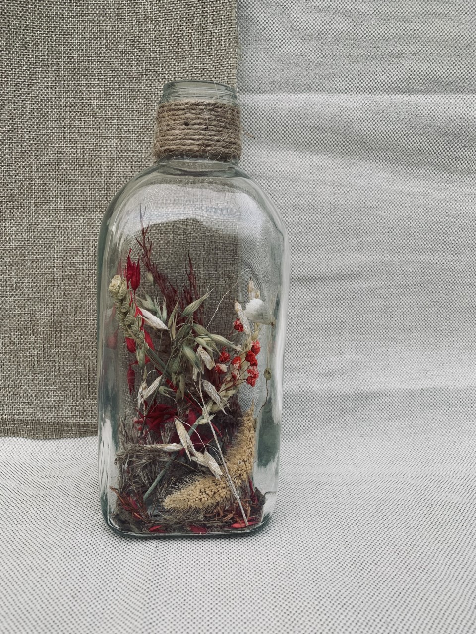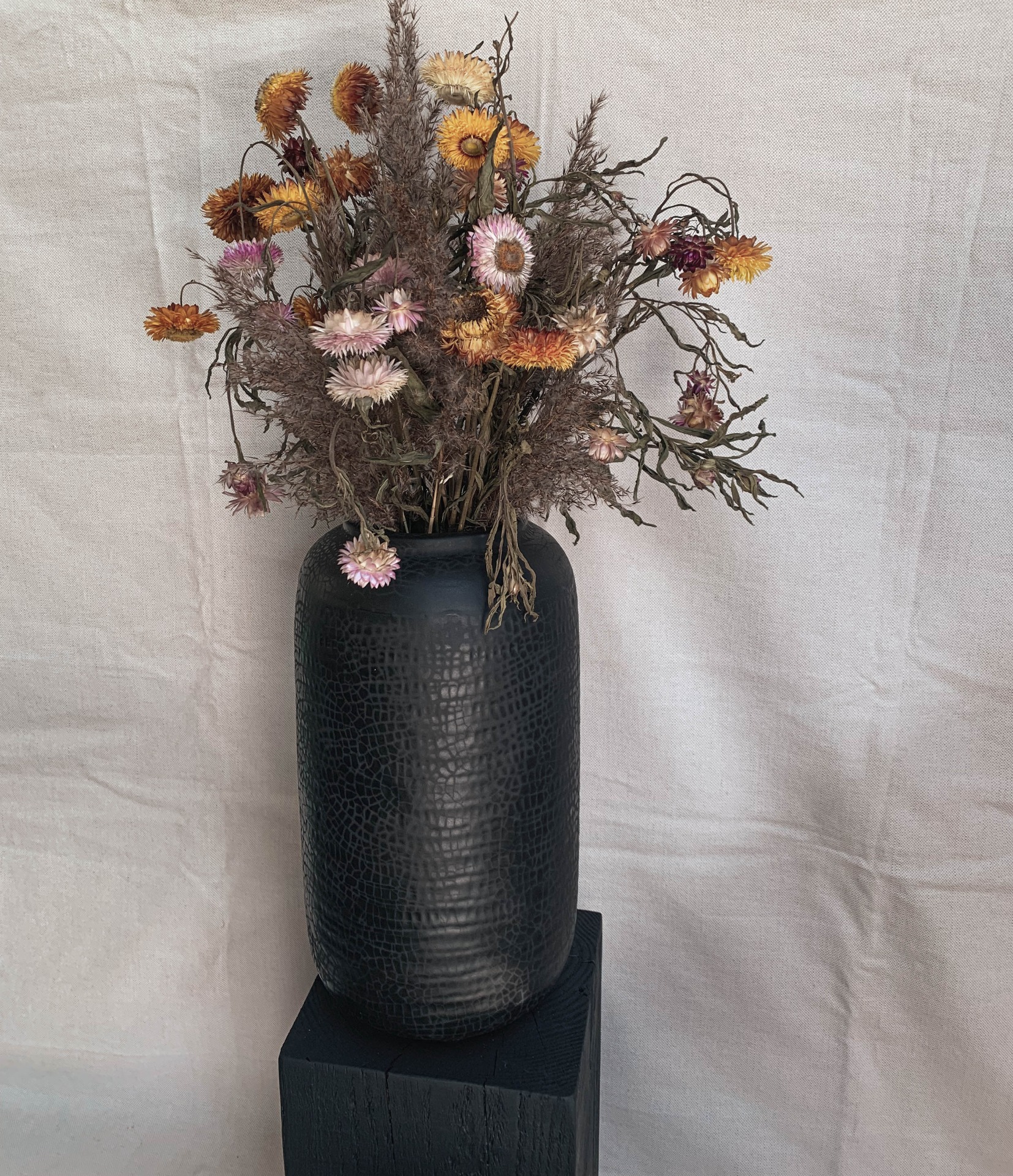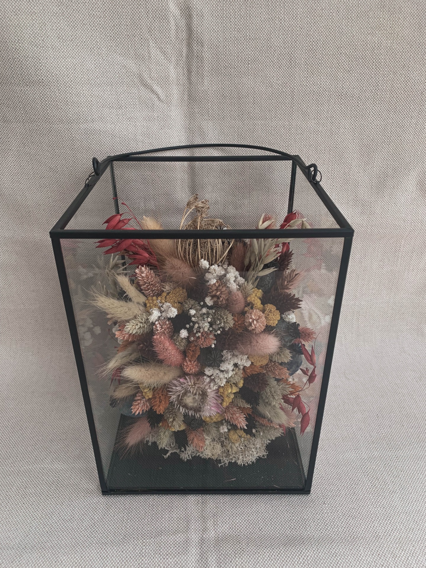 Vaas in brons look. Gevuld met verschillende kleuren droogbloemen.