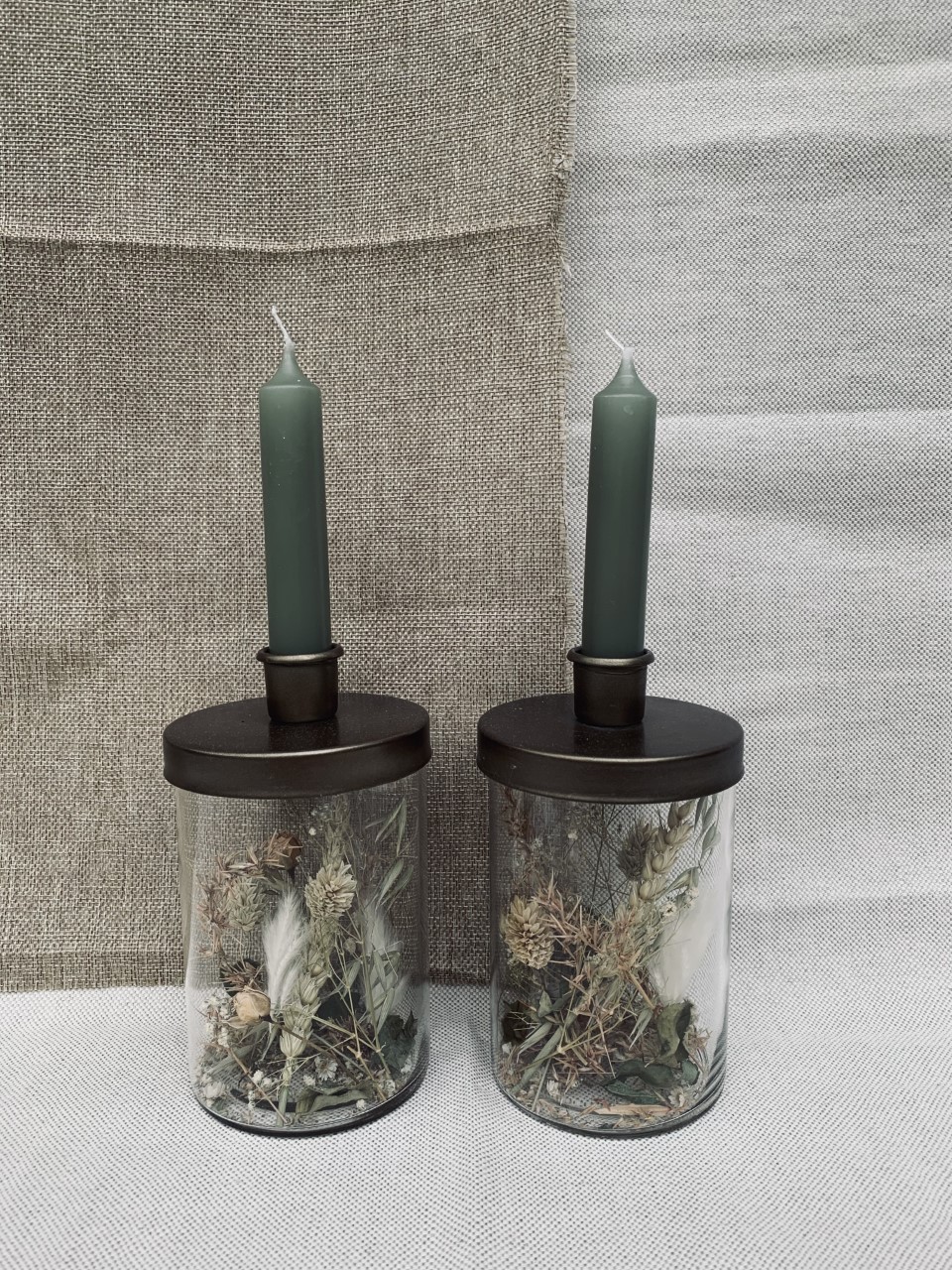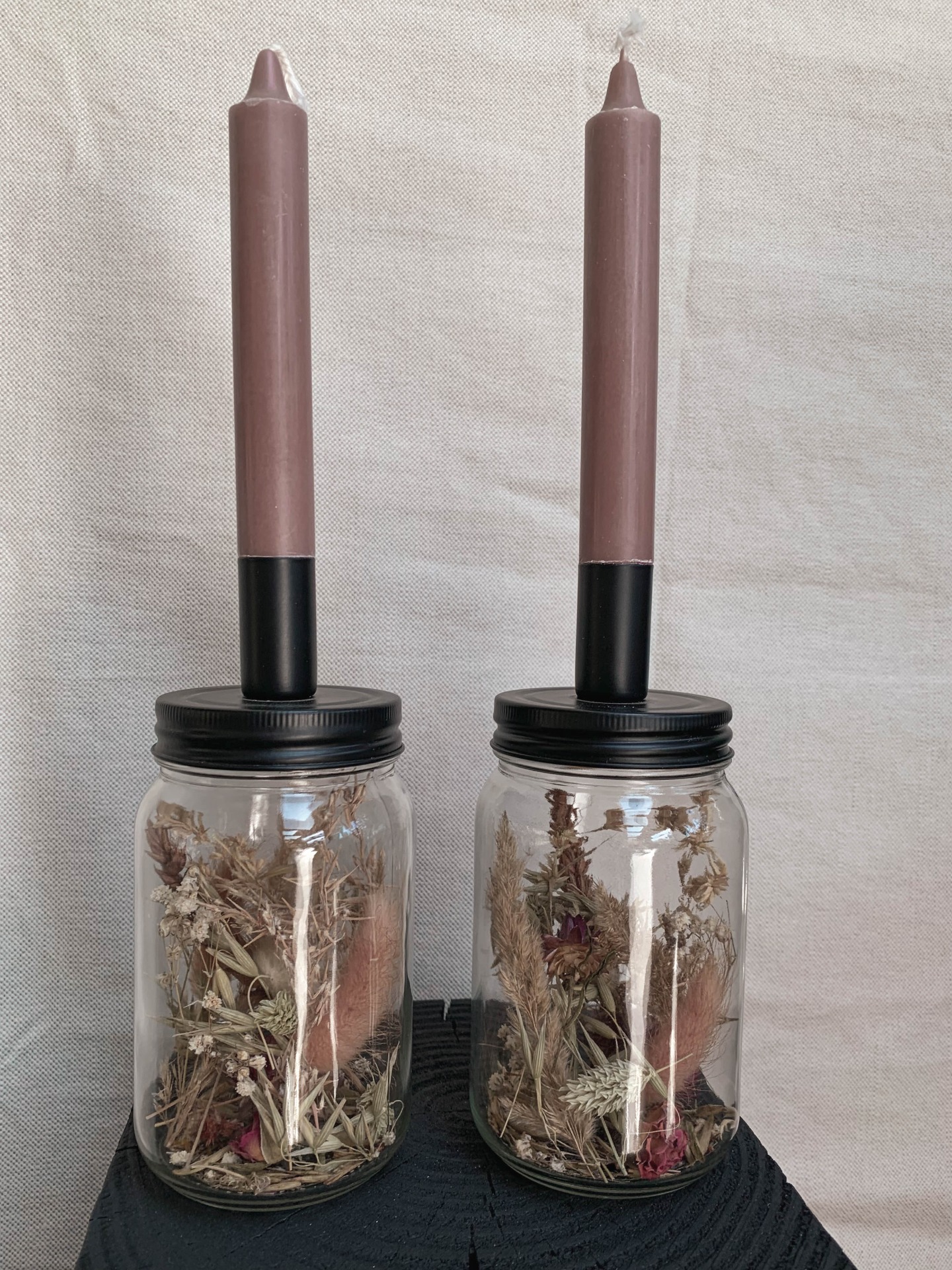 Kandelaars gevuld met roze droogbloemen en een mooie oud roze kaars.