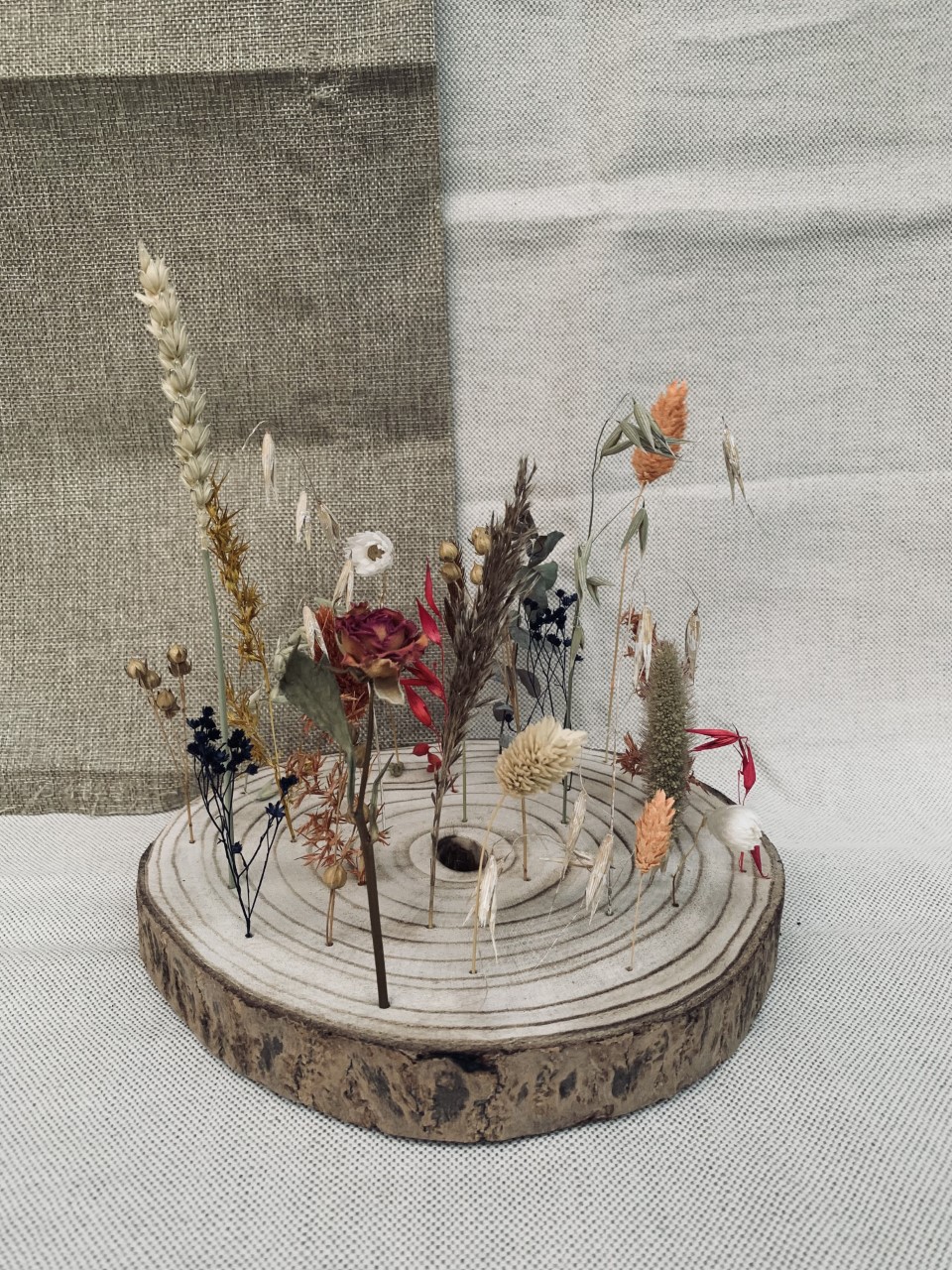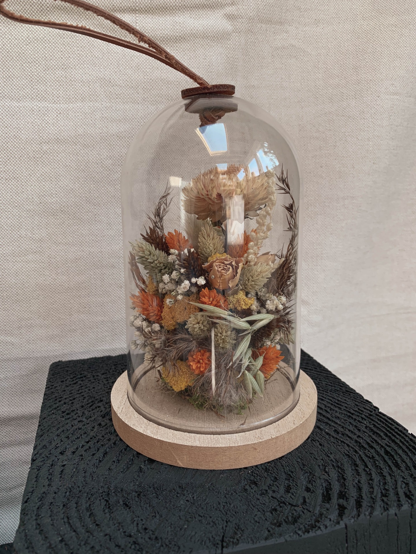 Stolpje met leren band. Veel verschillende kleuren droogbloemen in oranje/gele kleuren.