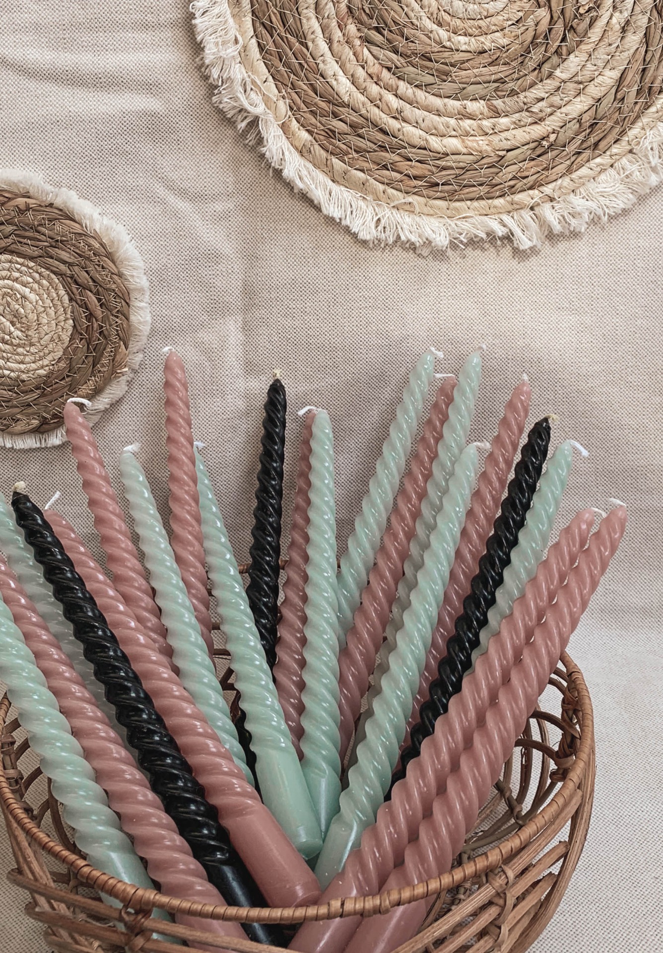 Twisted candles in de kleuren: mint-groen, oud-roze & zwart. Deze zijn 25 cm.