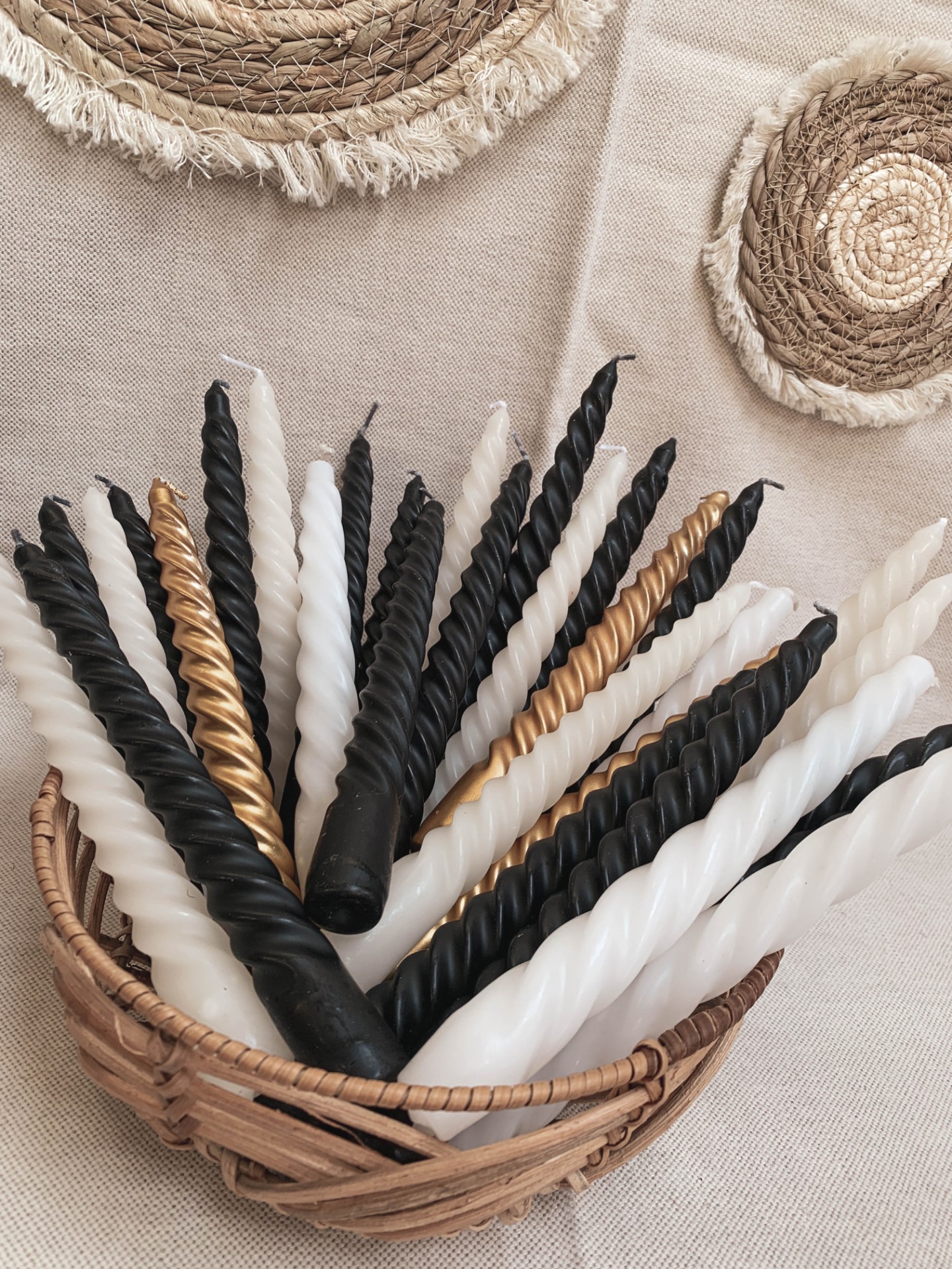 Twisted candles in de kleuren: zwart, goud, wit & crème. Deze zijn 20 cm.