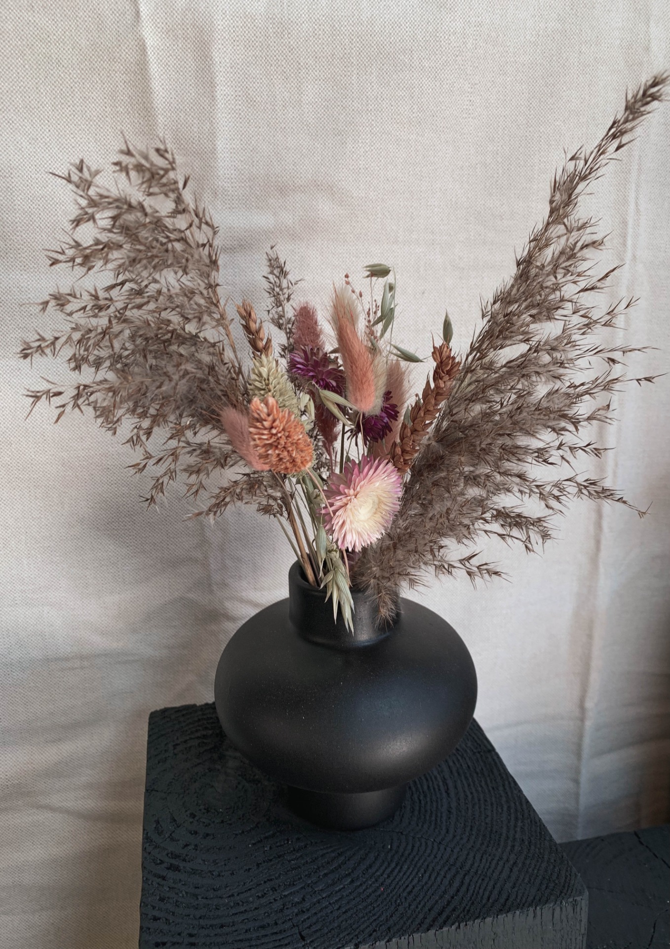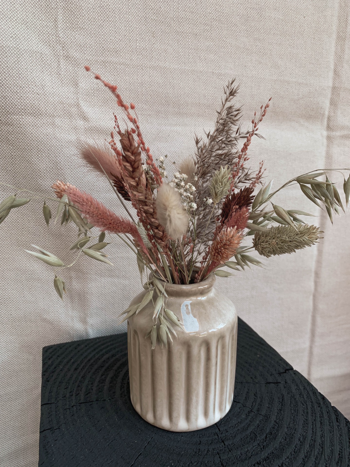 Crème vaasje gevuld met roze & naturel gekleurde droogbloemen.