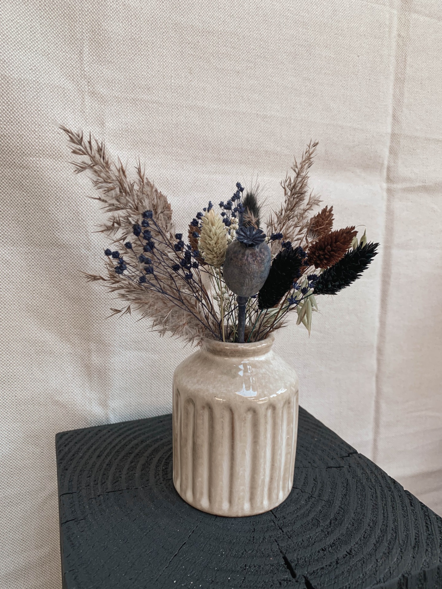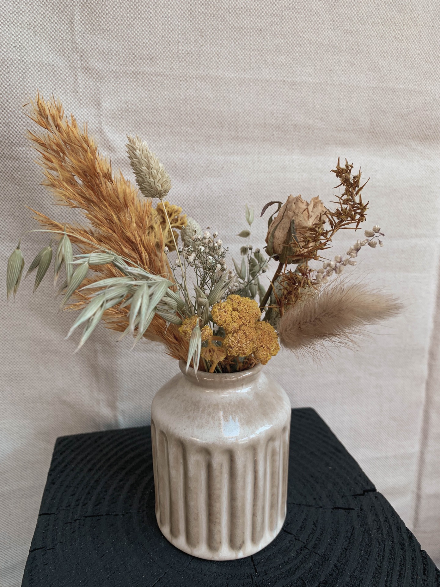 Crème vaasje gevuld met gele & naturel gekleurde droogbloemen.