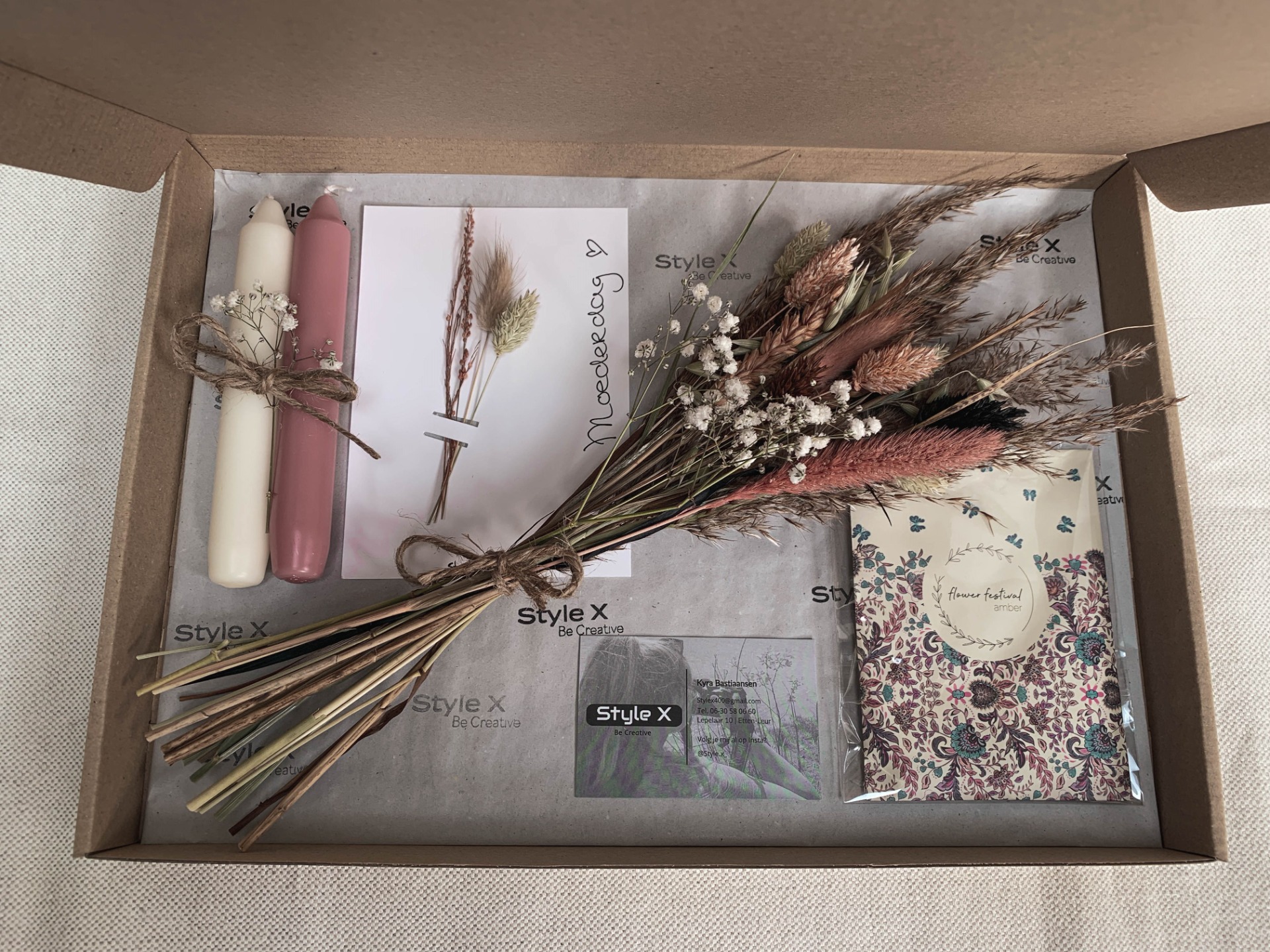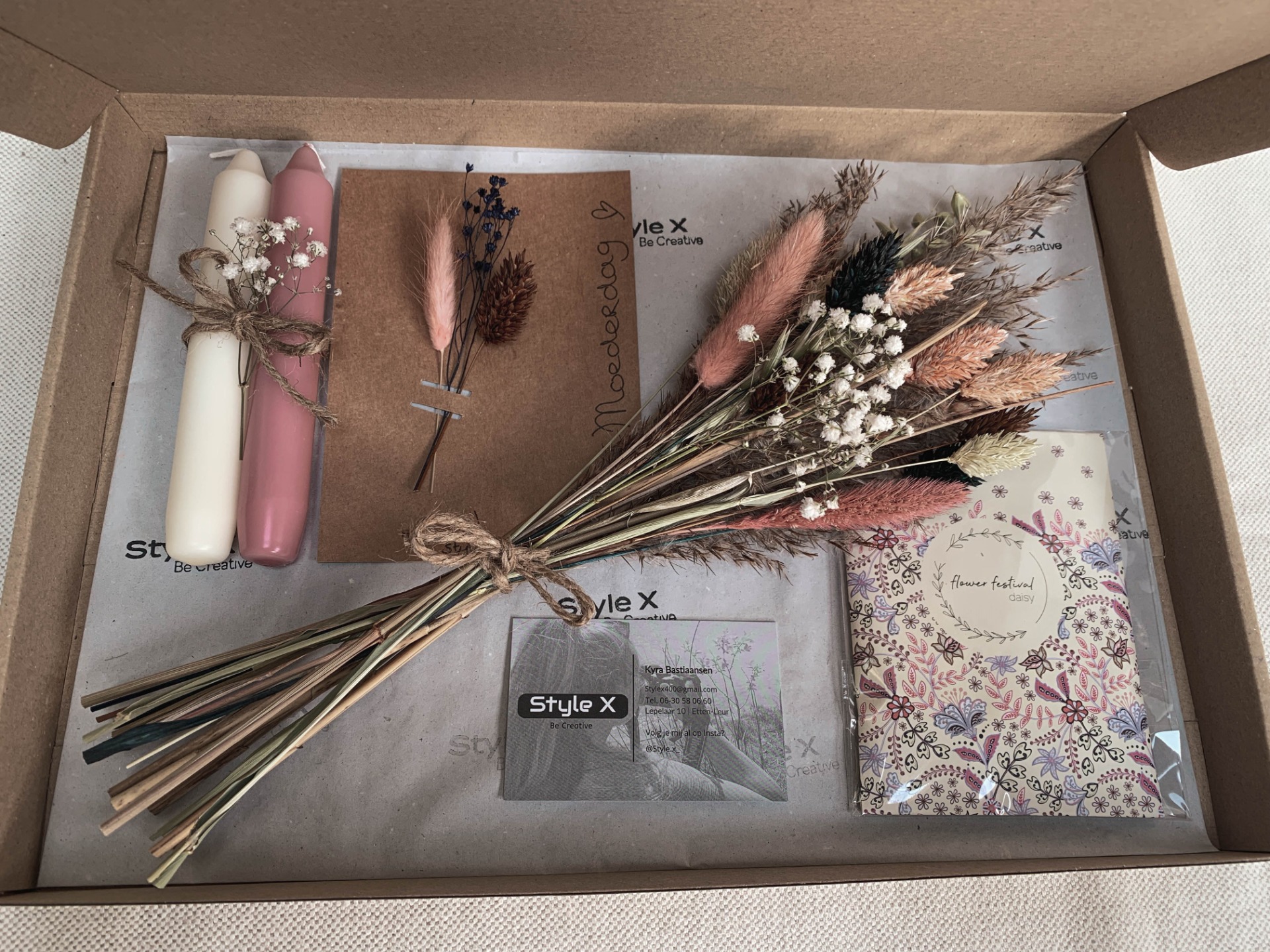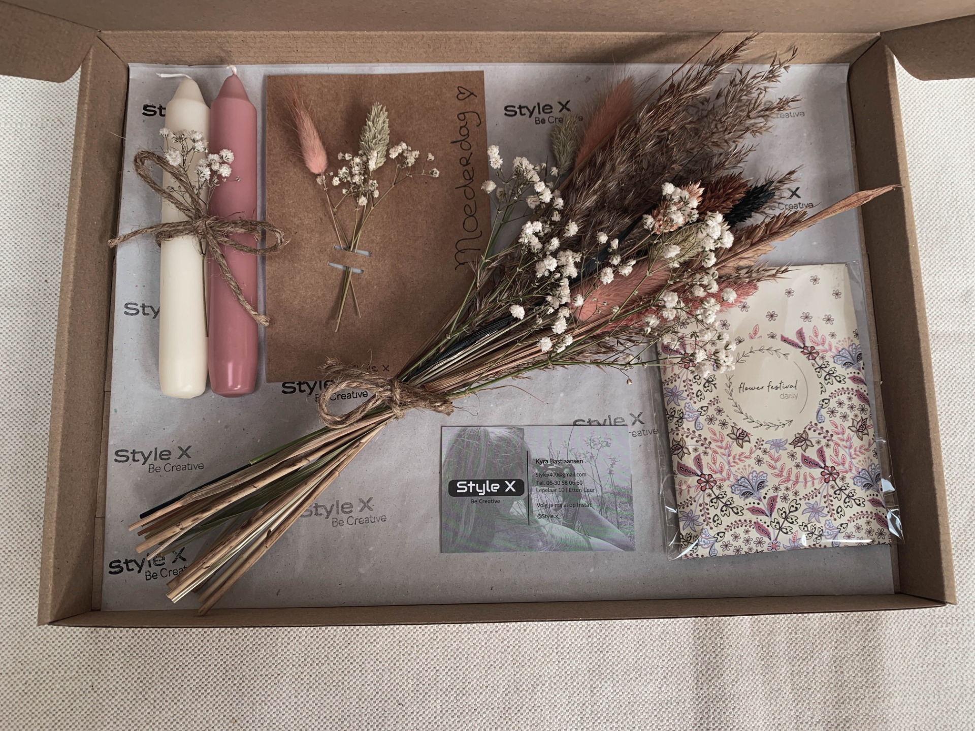 Verassing box met veel leuke dingentjes zoals: geurzakje, bosje droogbloemen, wenskaart voor Moederdag en een set kaarsen!