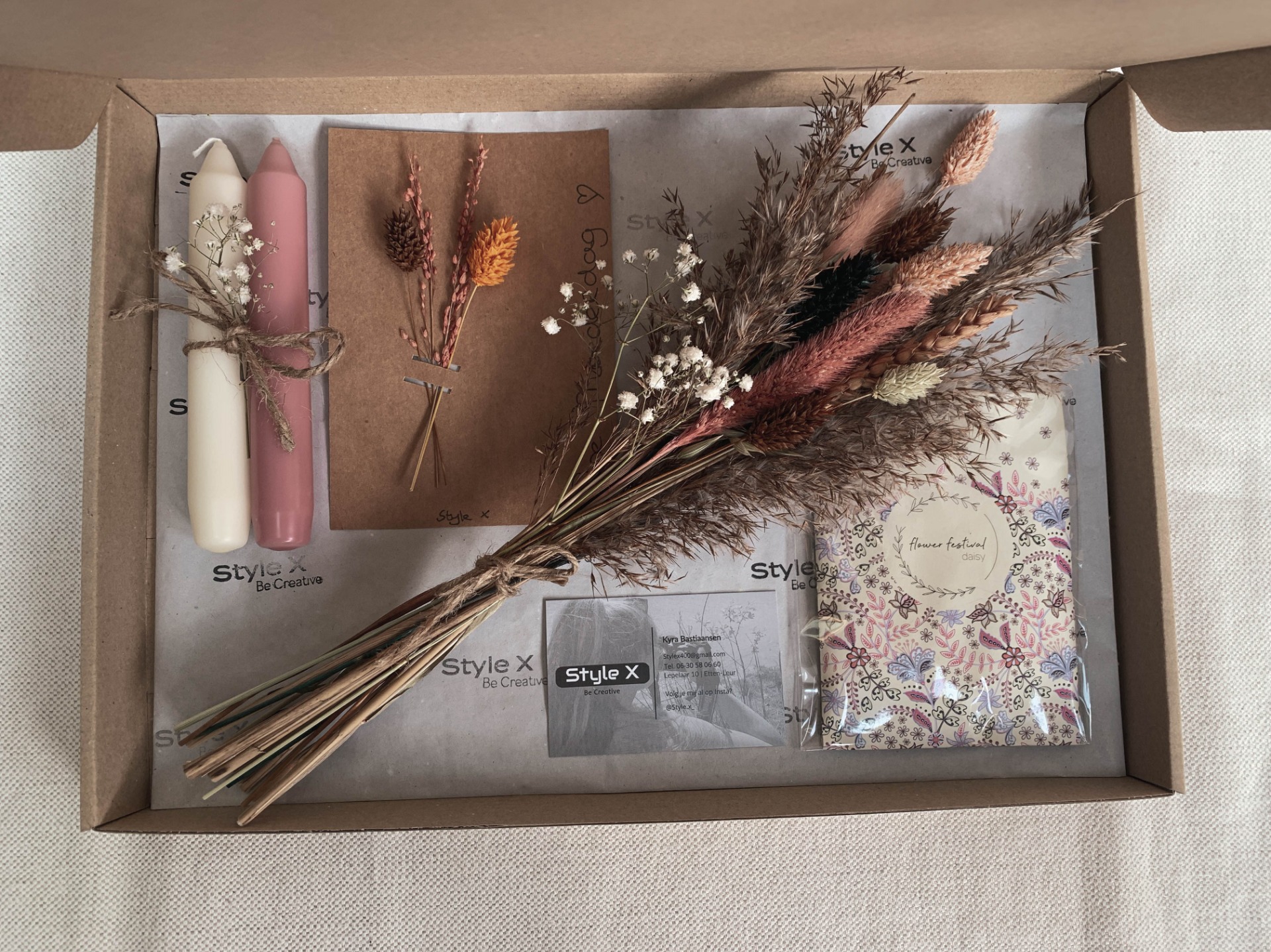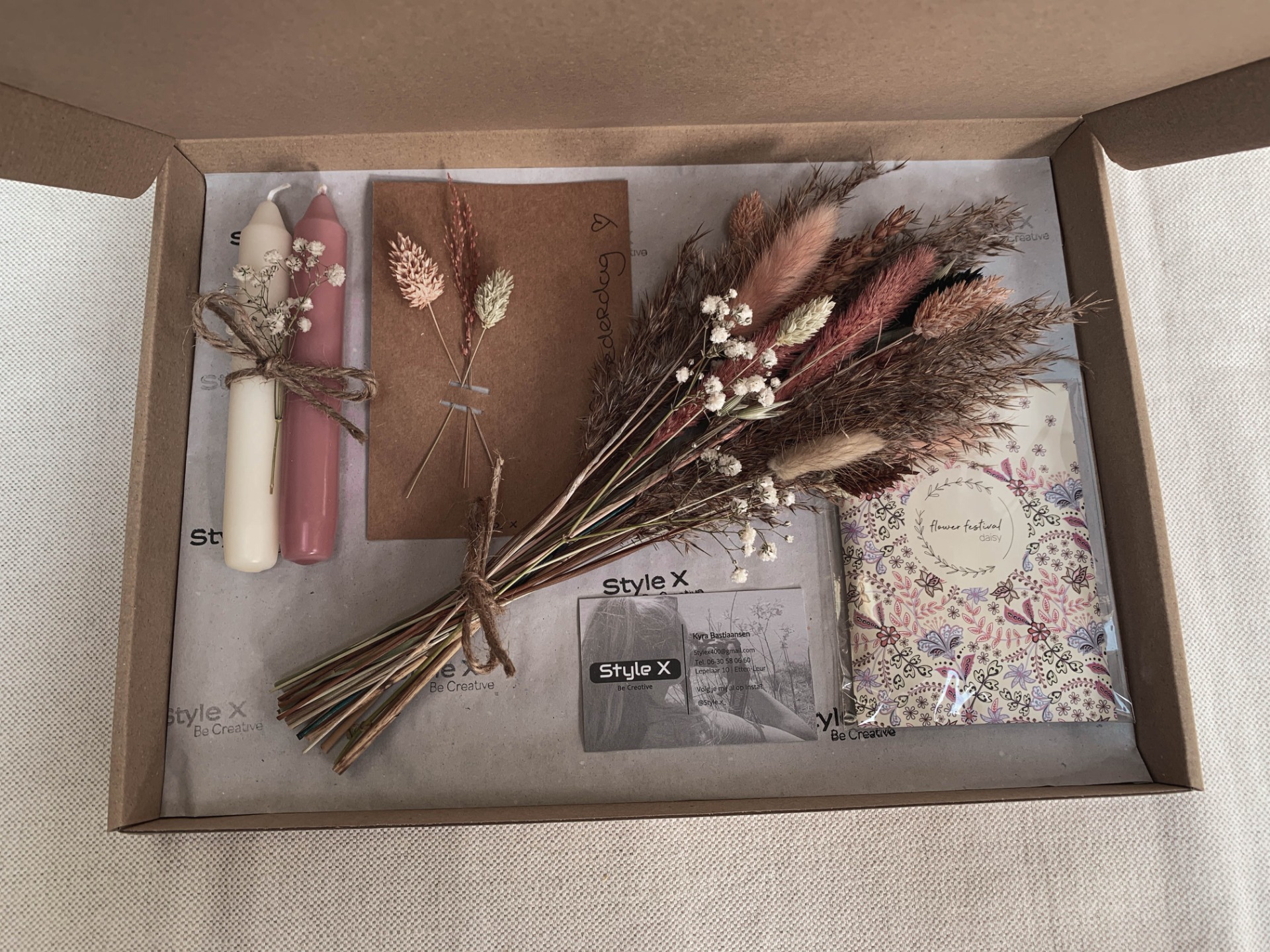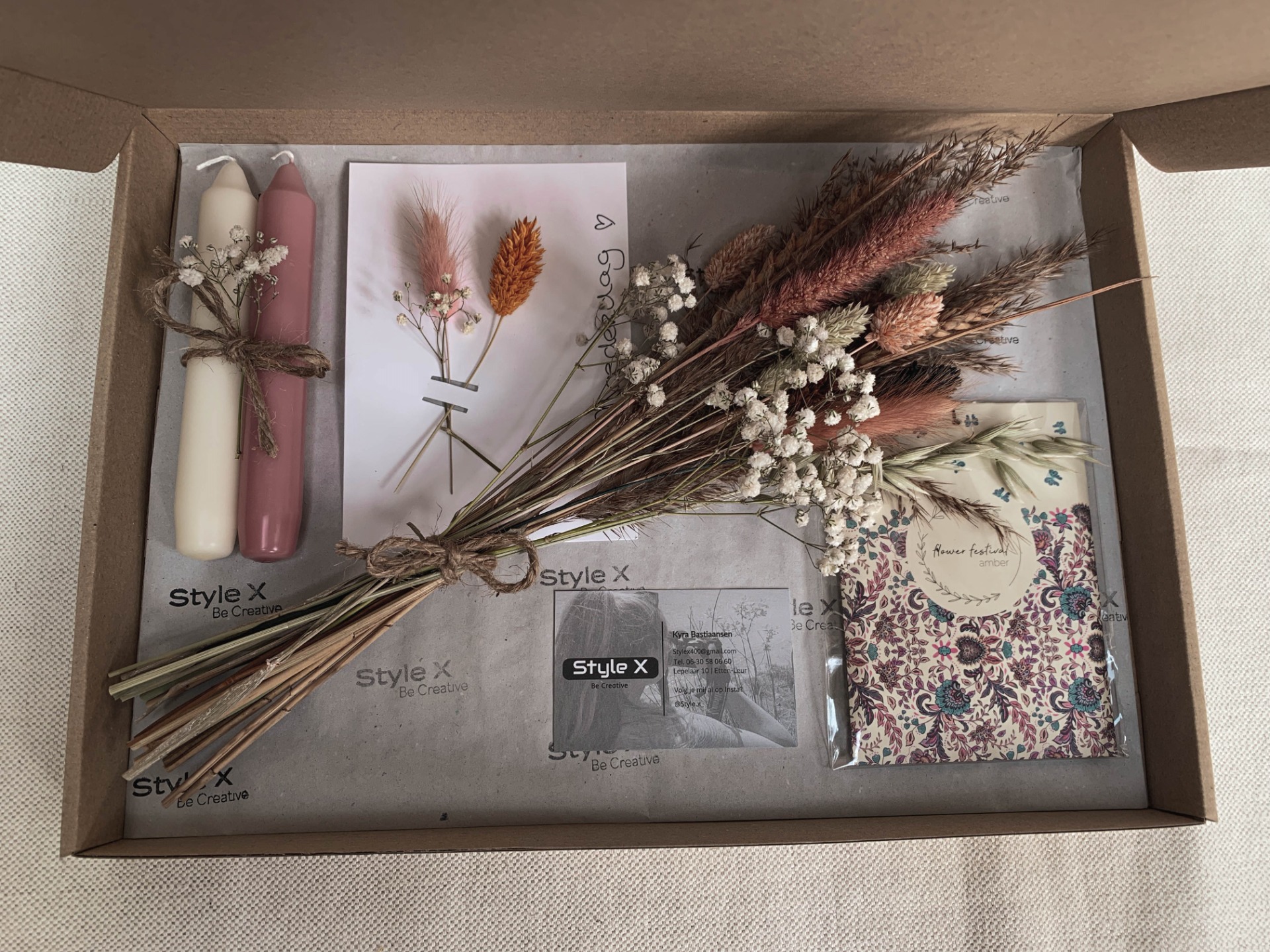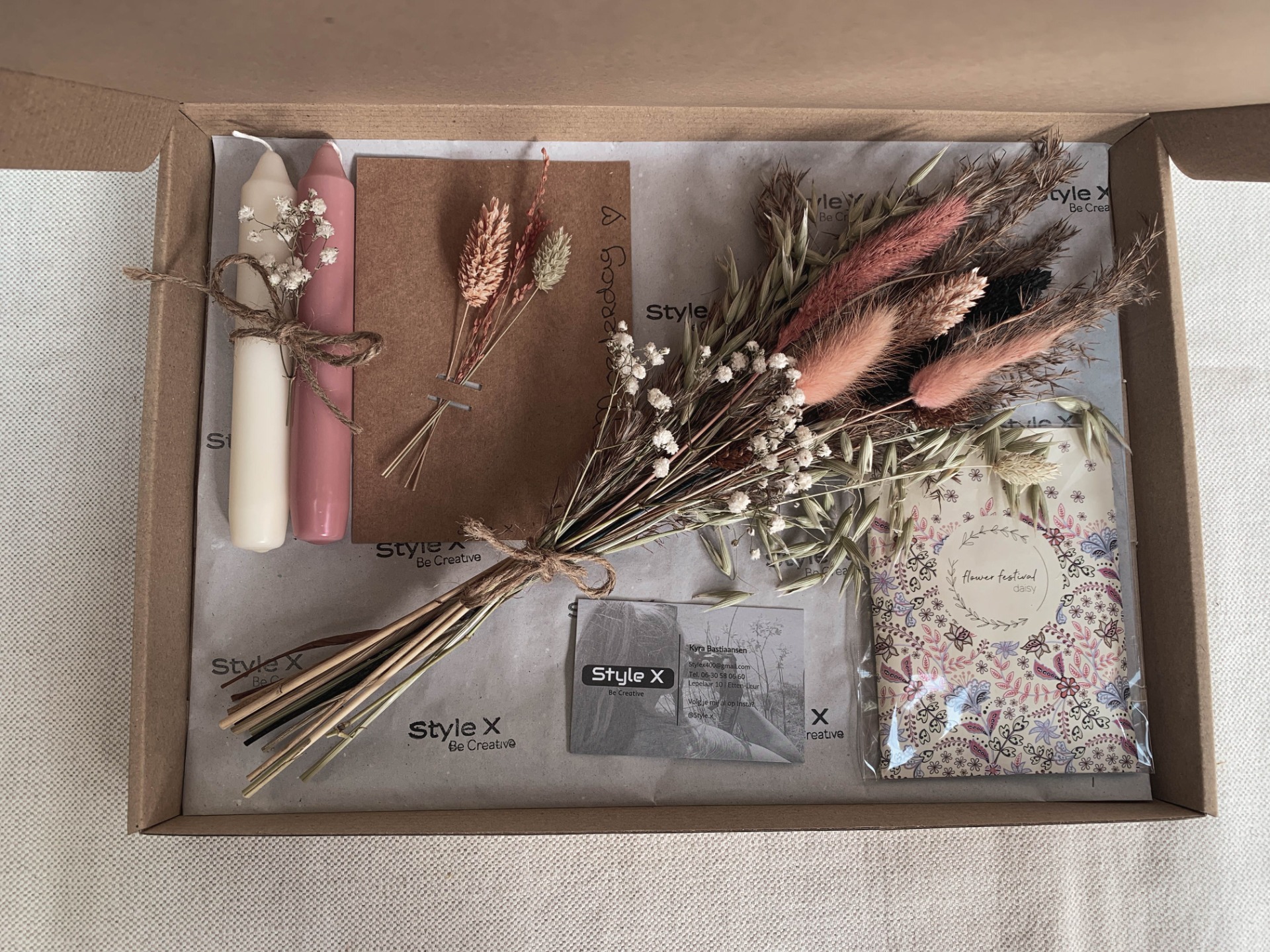 Verassing box met veel leuke dingentjes zoals: geurzakje, bosje droogbloemen, wenskaart voor Moederdag en een set kaarsen!
