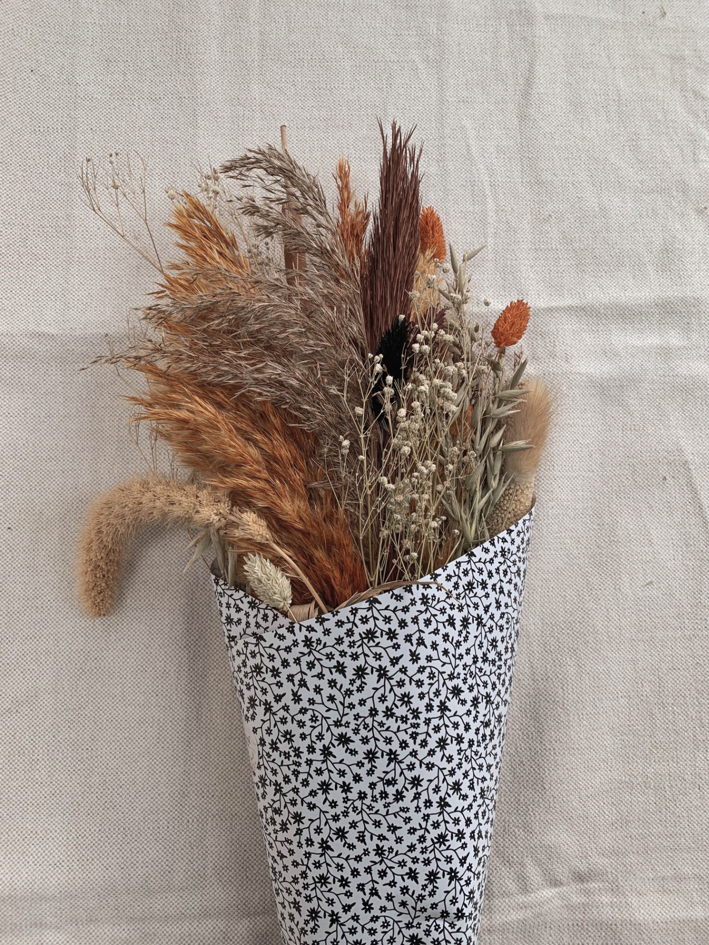 Droogbloemen boeketje met oranje/bruine kleurtinten.