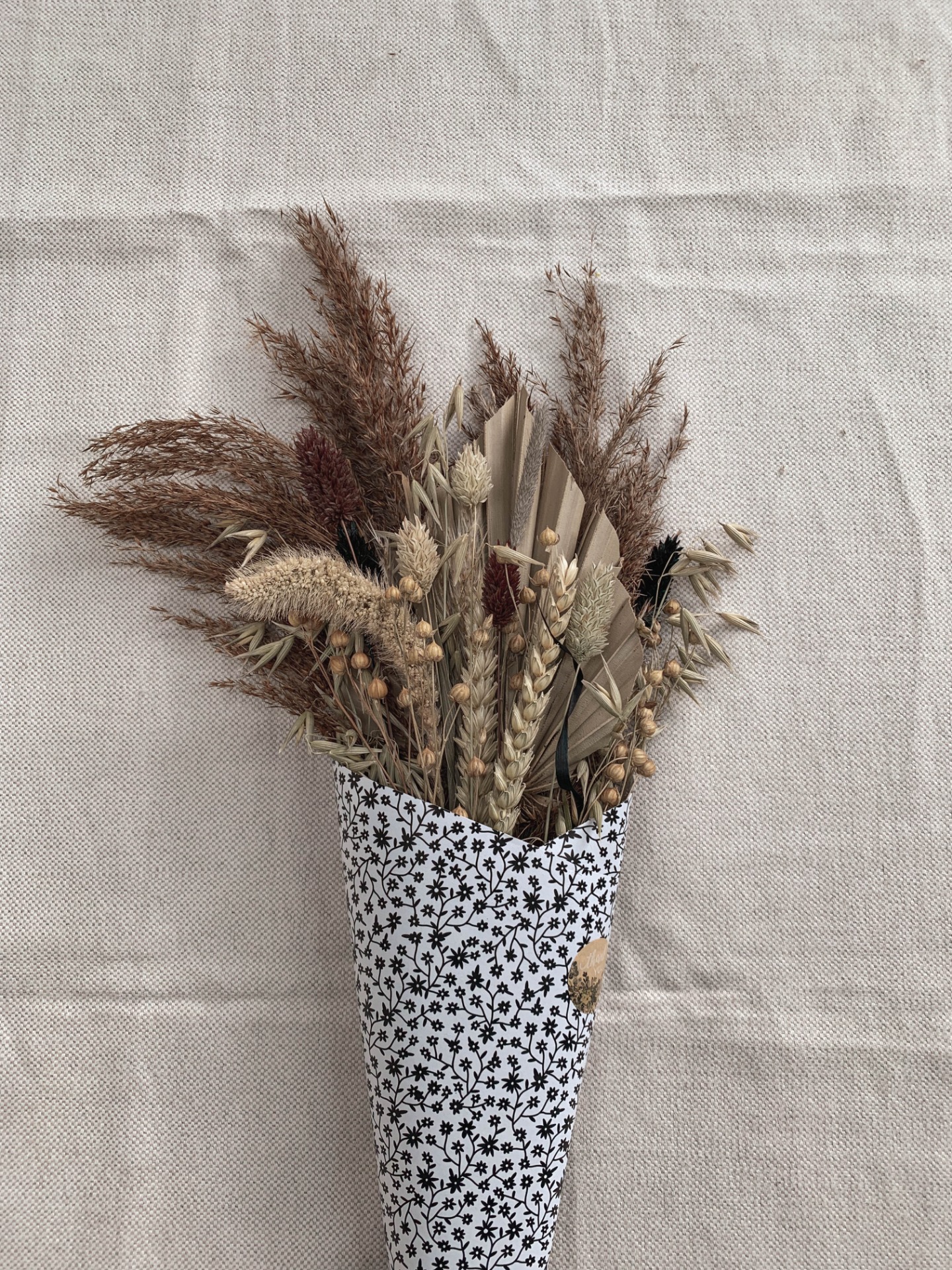 Droogbloemen boeketje met natuurlijke kleuren en palmblad.